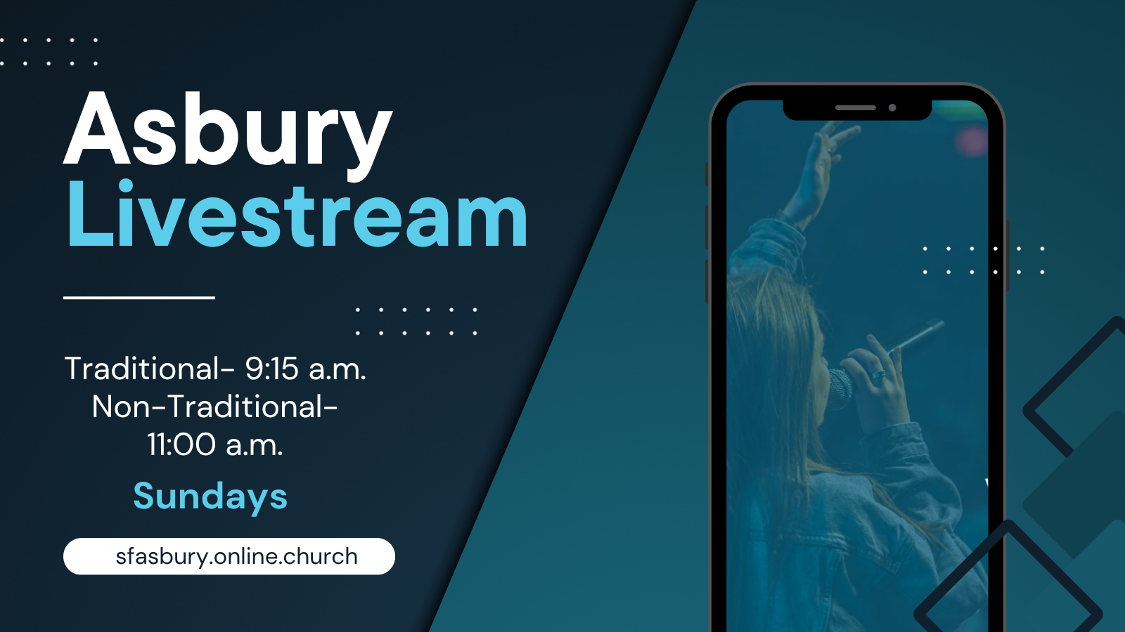 We are now live-streaming services on Sundays at 9:15 a.m. for the Traditional Service and 11:00 a.m. for the Non-Traditional Service on both the Asbury Facebook page and sfasbury.online.church. Service replays will be available on the Asbury Facebook page and .Asbury’s Vimeo page